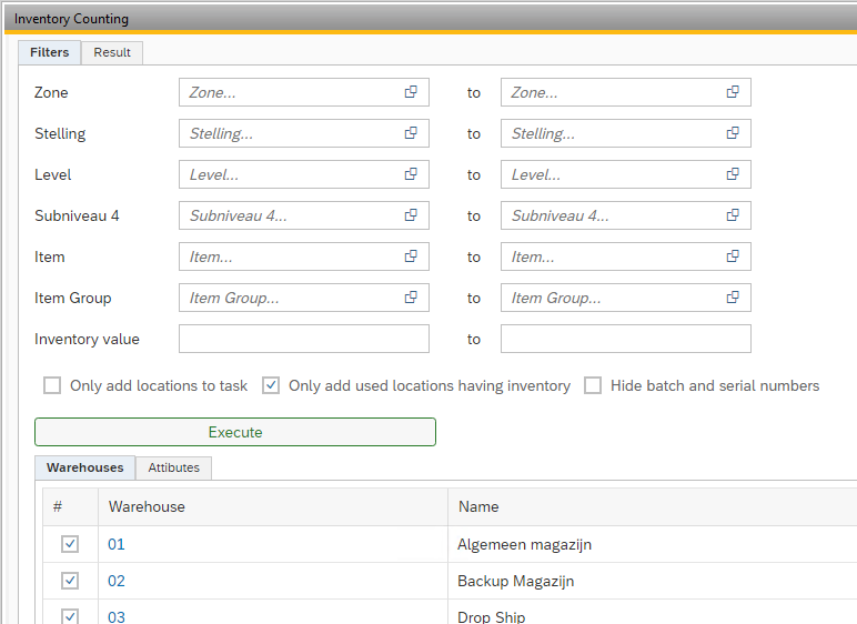 With these filters, a range of the warehouse can be selected to be included in the count list. The options Only add locations to task , Only add used locations having inventory and Hide batch and serial numbers can also be used to determine what the task should be filled with.