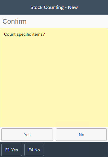 You will first be asked to enter a location. A warehouse without locations can optionally be selected via the F2 - Warehouse button. A question immediately follows. Count specific items?