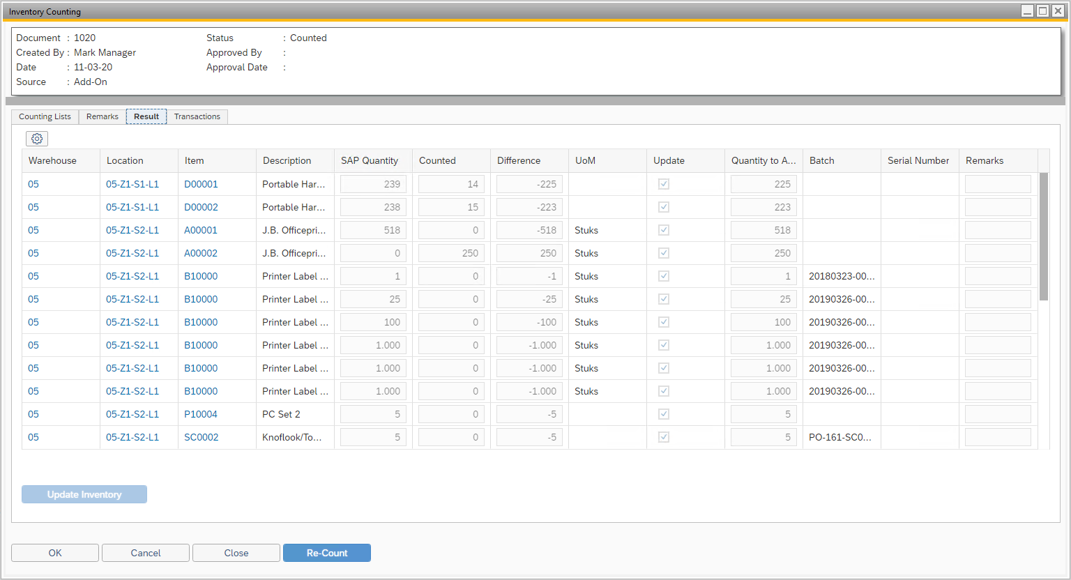 If this is expected according to settings, a Re-Count can be generated from the Result of the WarehousePro Inventory Counting task via the Re-Count button. This re-count will be added as a new counting list within the relevant task. This counting list will always contain a specific selection of items and locations (including specific batch and serial numbers).
