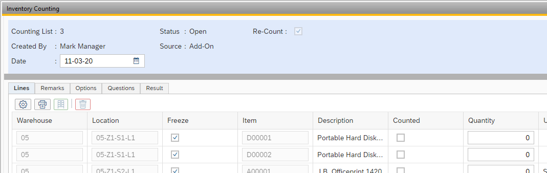 In addition, the lines of the relevant Re-Count can no longer be edited. Only the Counted checkmark and the Quantity may be changed. This continues in the same way as for a normal Counting list.